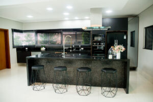 Um balcão planejado pode funcionar como divisória entre a cozinha e a sala, enquanto estantes e painéis sob medida organizam os ambientes sem perder a fluidez.